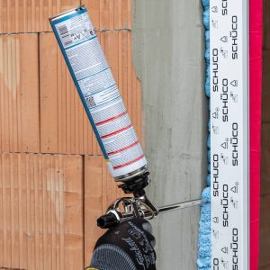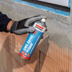 - Przed przyklejeniem taśmy zewnętrznej do muru ponownie stosujemy SWS Spray Primer, wyposażony w regulowaną dyszę kierunkową, która umożliwia rozpylenie produktu zarówno w płaszczyźnie pionowej, jak i poziomej.